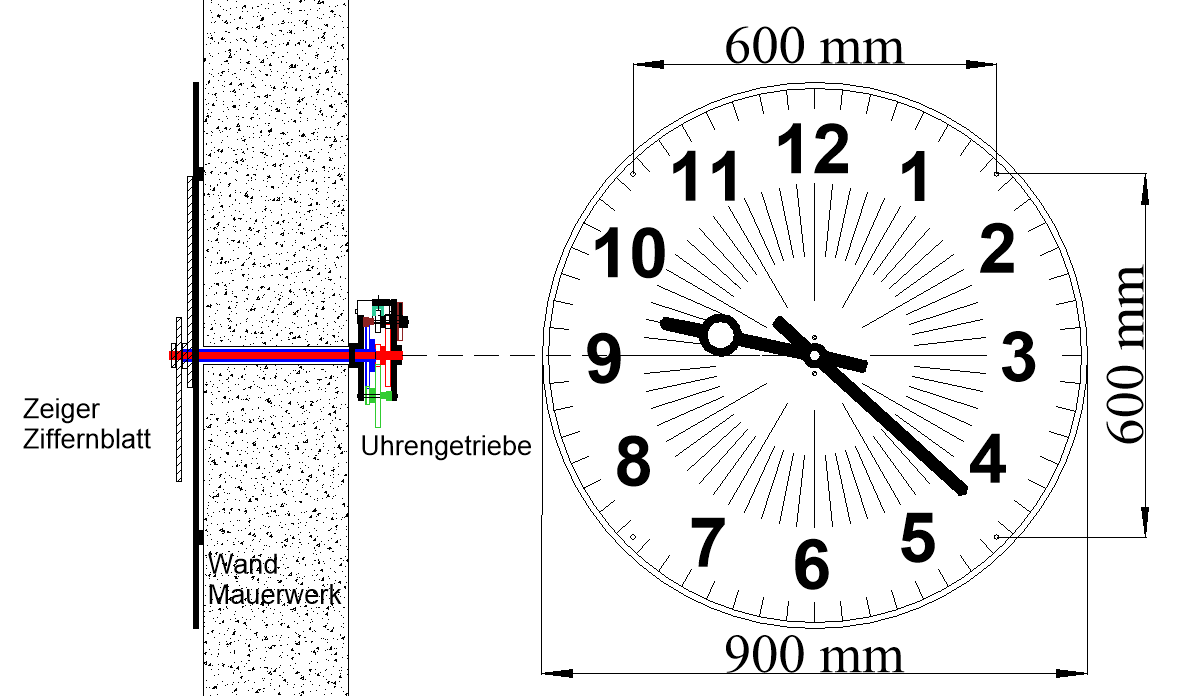 Z.Bsp. wenn das Ziffernblatt + Zeiger außerhalb des Gebäudes liegt und das Uhrengetriebe innerhalb, muss die Wandstärke des Gebäudes mitgeteilt werden. (siehe Skizze)